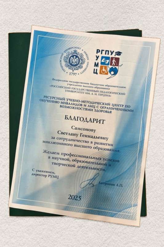 За значительный вклад в создание доступной образовательной среды и развитие инклюзивного высшего образования благодарностью Ресурсного учебно-методического центра по обучению инвалидов и лиц с ограниченными возможностями здоровья была отмечена Светлана Геннадьевна САМСОНОВА, ответственный за работу с обучающимися с инвалидностью и ОВЗ.